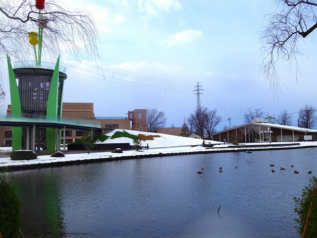 ひょうたん池には、カモが飛来しています。