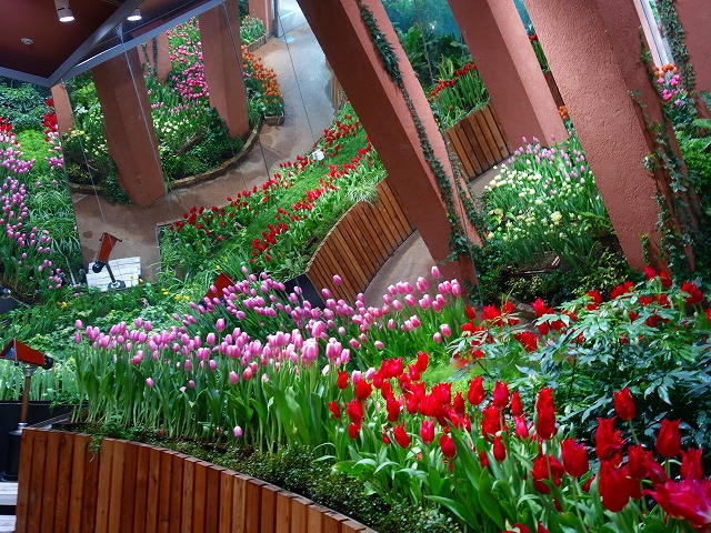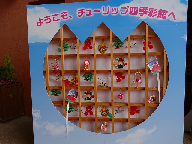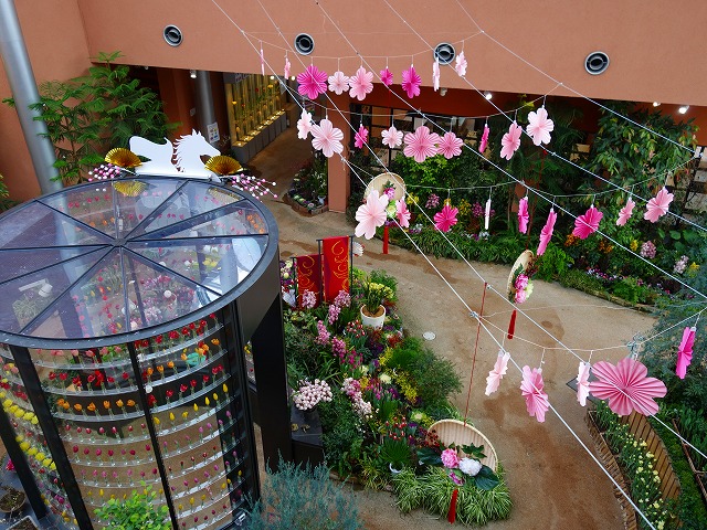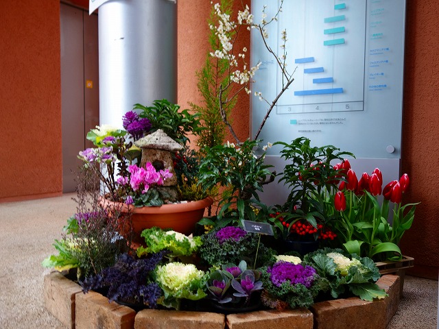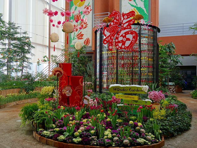 今回は促成栽培で開花させたチューリップや、紅白のハボタン、千両、万両の名のつく「縁起物植物」、冬に楽しむシンビジウムなどの植物と、上部空間の「福」や「馬」の文字と花を組み合わせたデイスプレイなど赤色を多く配した展示で、特別なお正月にふさわしい華やかさをお楽しみください!