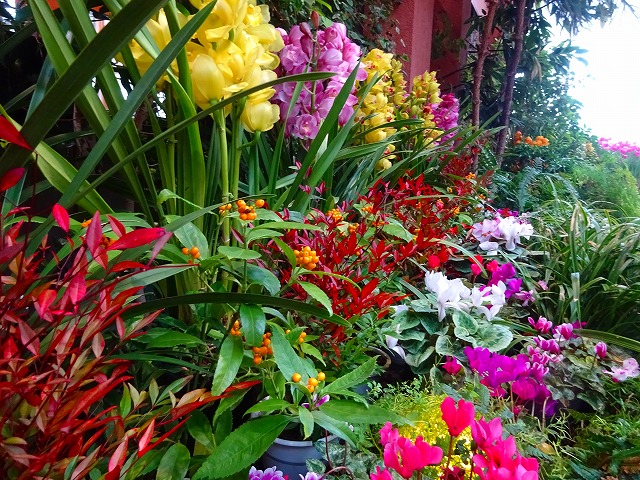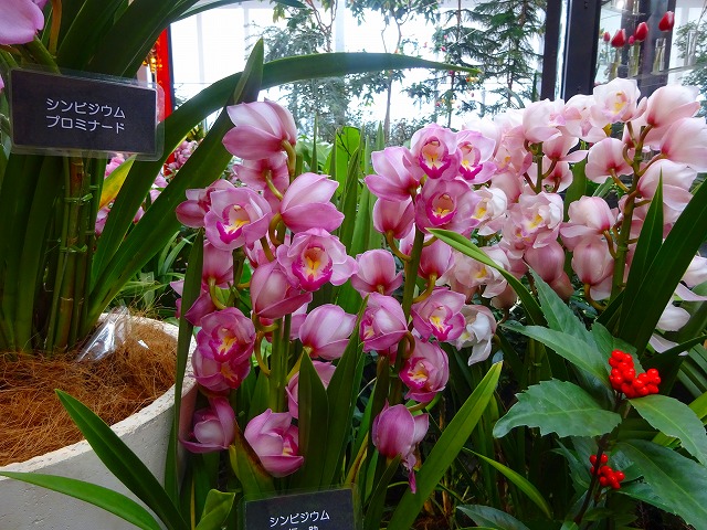 シンビジウム、センリョウ(黄実)、ナンテン、シクラメン