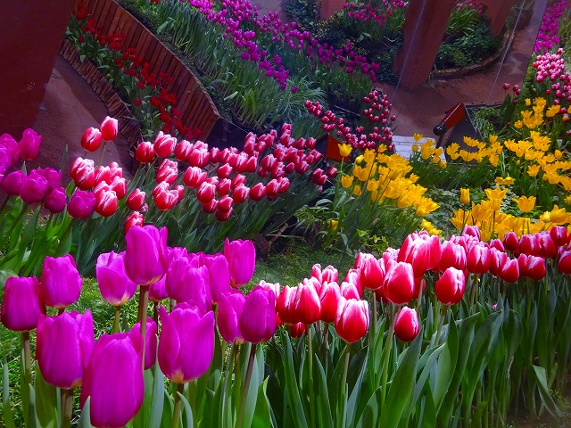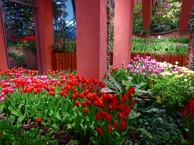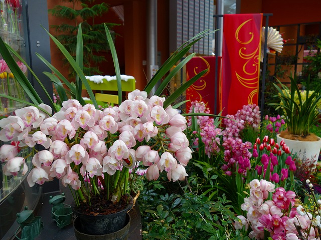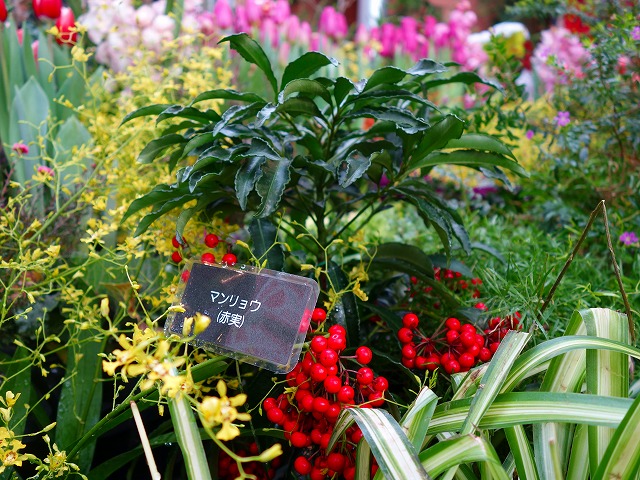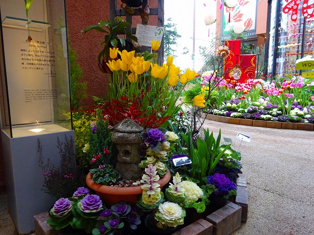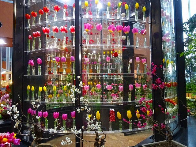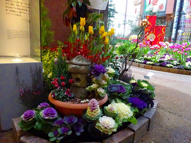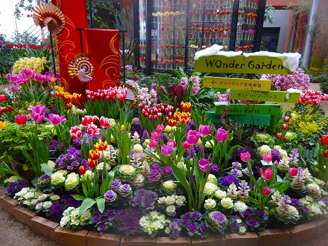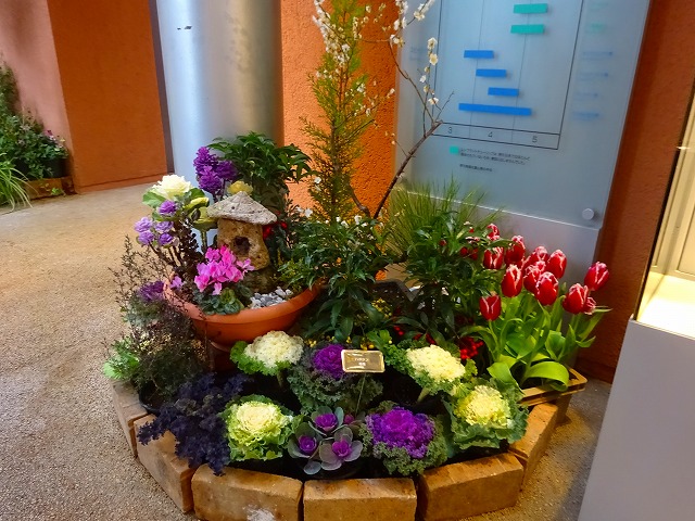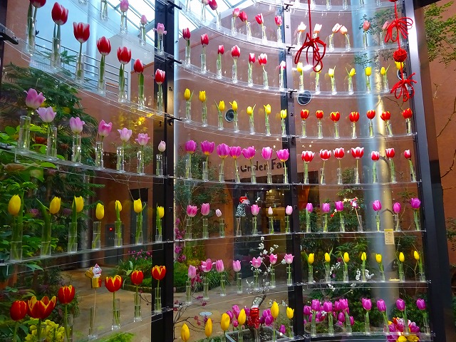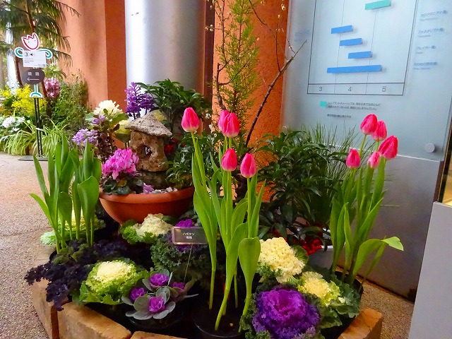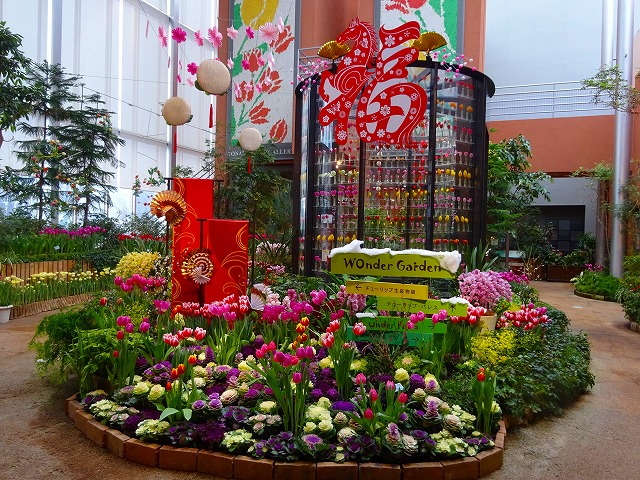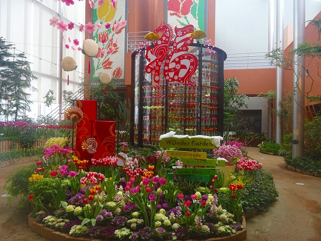 今回は促成栽培で開花させたチューリップや、紅白のハボタン、千両、万両の名のつく「縁起物植物」、冬に楽しむシンビジウムなどの植物と、上部空間の「福」や「馬」の文字と花を組み合わせたデイスプレイなど赤色を多く配した展示で、特別なお正月にふさわしい華やかさをお楽しみください!