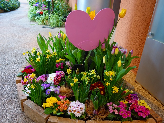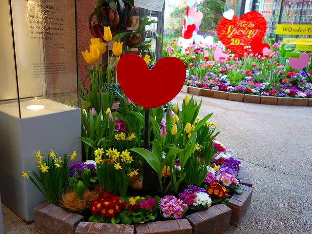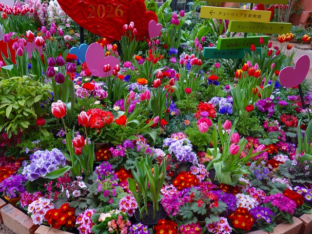 促成栽培で開花させたチューリップと、早春を彩る草花のプリムラ類(プリムラオブコニカ、プリムラマラコイデス、プリムラポリアンサなど)や、球根植物(アネモネ。ラナンキュラス、スイセン)でワンダーガーデンを華やかに彩ります。