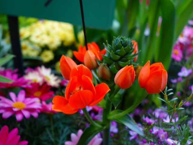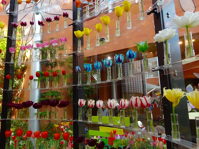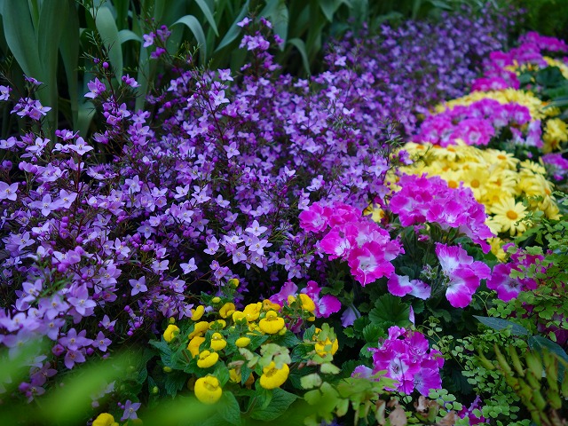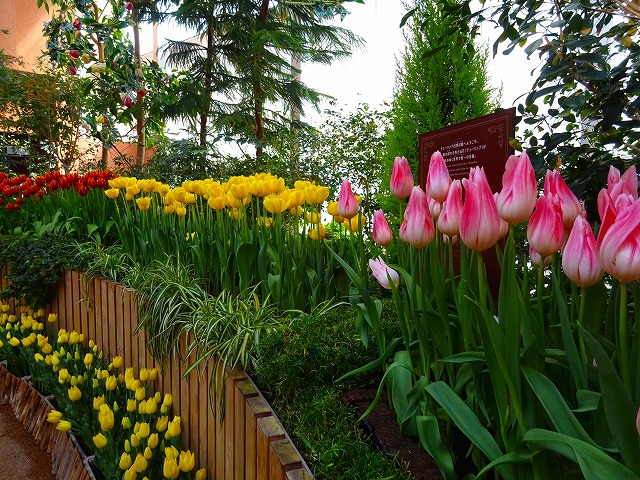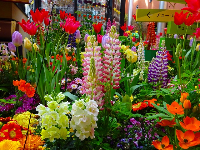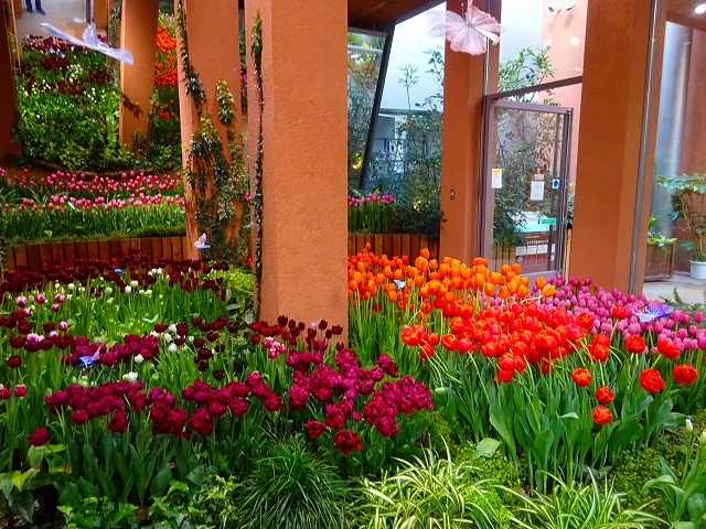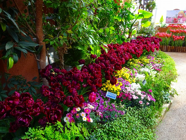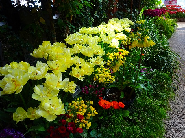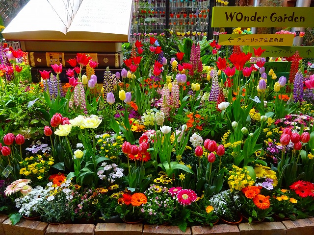 ユリ咲き、八重咲き、フリンジ咲きの他に、それぞれに不規則な模様が入る「フレーム咲き」、1本から複数の花が咲く「枝先き」のチューリップと、マーガレットやルピナス、カルセオラリアなど春を彩る花々でワンダーガーデンを華やかに彩ります。