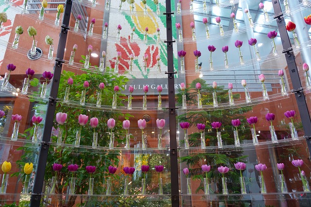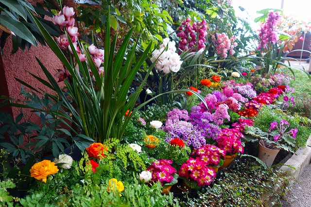 促成栽培のチューリップとプリムラ、球根植物(アネモネ、ラナンキュラス、スイセン)などの早春の花々でワンダーガーデンを華やかに彩ります。