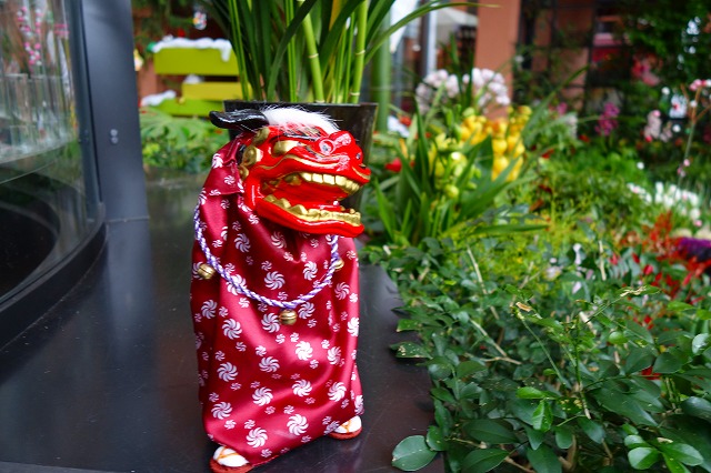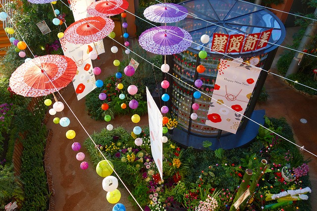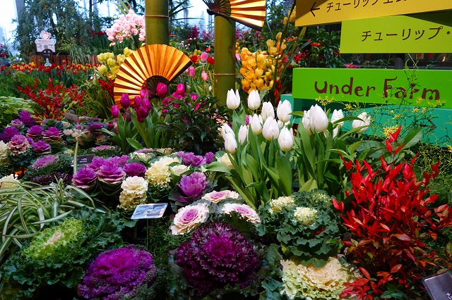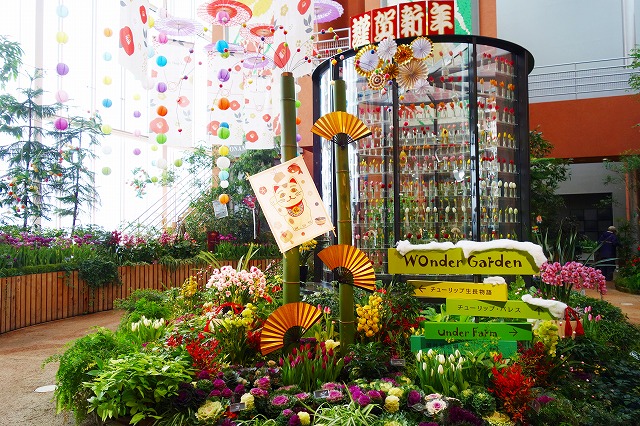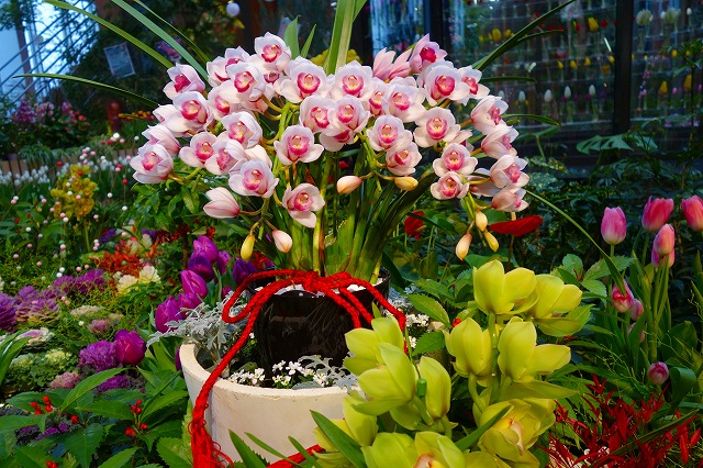 チューリップと新春には欠かせない縁起物植物「センリョウ」「マンリョウ」「ハボタン」と豪華な「シンビジウム」などの花々を中心に展示します。